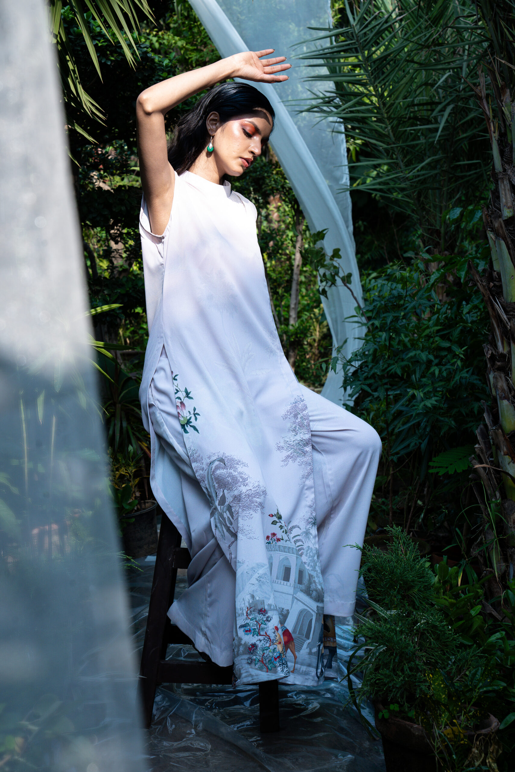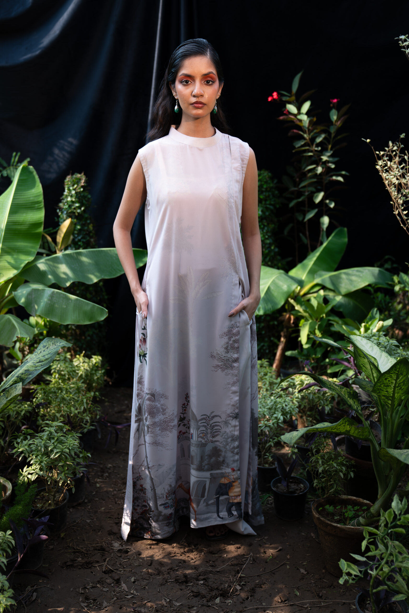 • Description: Pastel grey A-line printed flowy shirt with side and central slits paired with loose fit trousers with pockets.